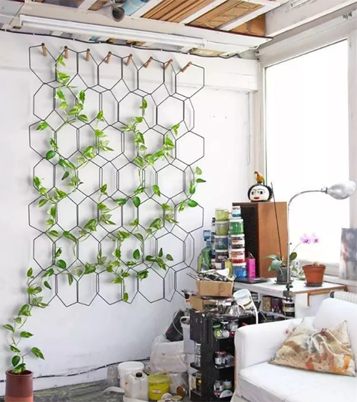用金屬絲按規(guī)則或不規(guī)則的方式組合成一個(gè)整體,讓植物順著幾何架構(gòu)自然的延伸和生長,待它茂盛時(shí)你收獲的不僅是滿眼的綠色好風(fēng)景,更是清新怡人的好空氣。推薦植物:綠蘿。