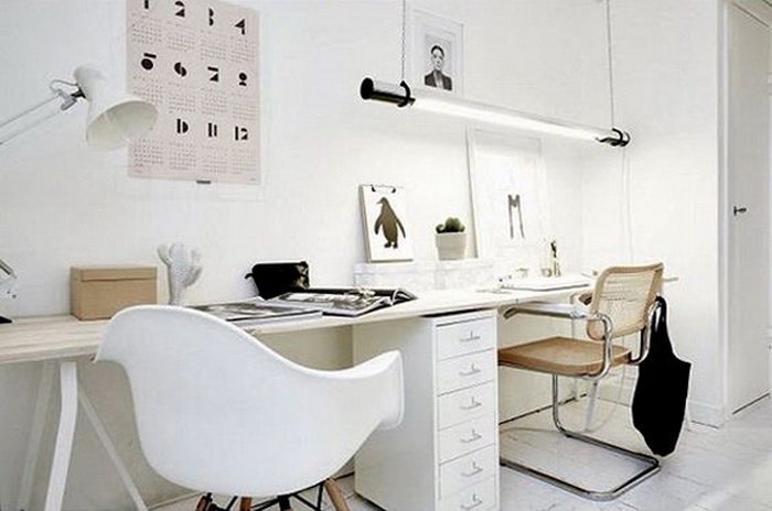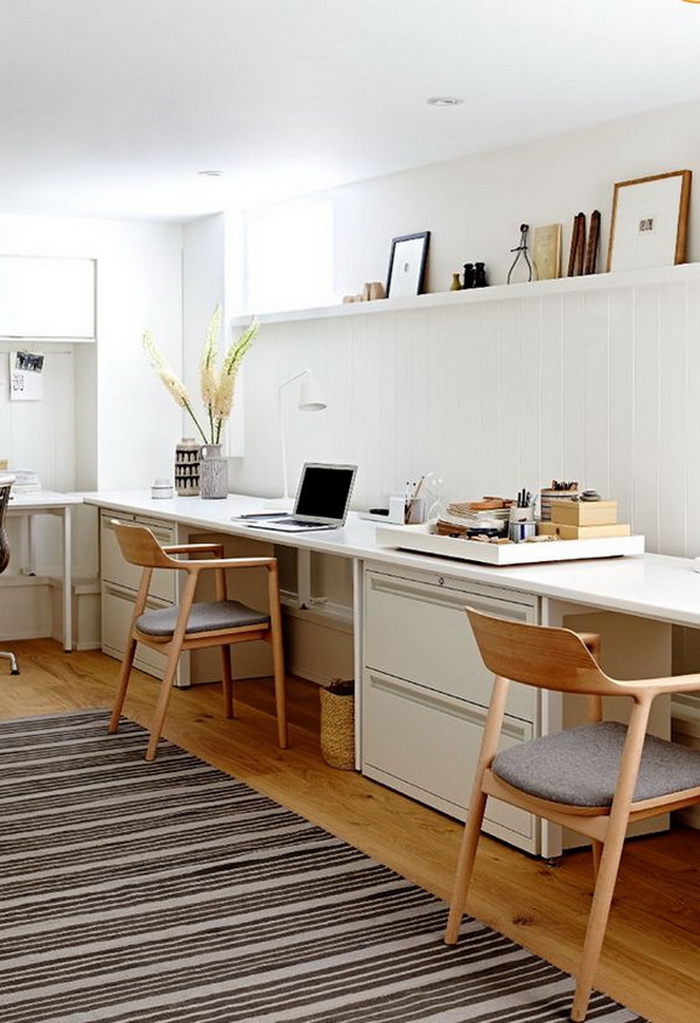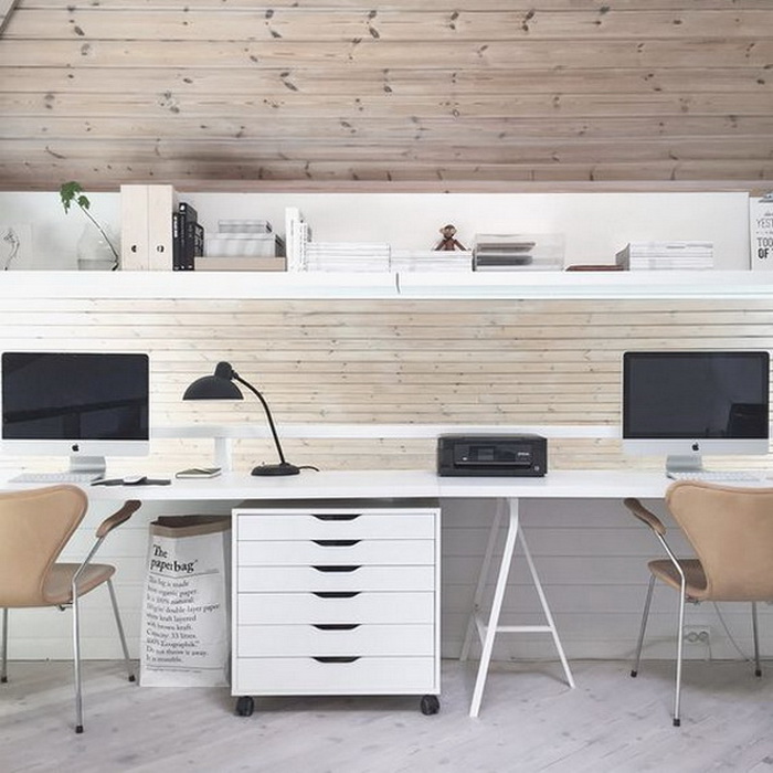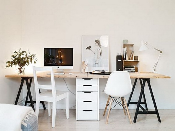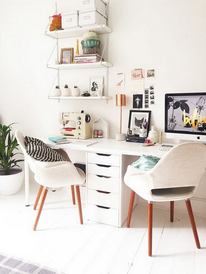 對于兩個(gè)人書桌布置,可以對著坐、并排坐或者背靠背,也可以L型轉(zhuǎn)角坐,看個(gè)人喜好和具體空間格局而定。