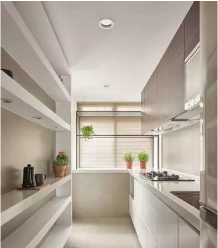 ▲在家也能有餐具展示墻:捨棄封閉柜體,利用大面積開(kāi)放層架收納兼展示餐瓷,更特別在中間層架裝設(shè)投射燈,運(yùn)用光線襯托餐瓷的氣勢(shì)并營(yíng)造視覺(jué)焦點(diǎn);善用窗臺(tái)空間收納小型家電:利用廚房末端的窗臺(tái)空間收納電鍋、烤箱等小家電,可避免壓縮到狹長(zhǎng)型廚房的走道空間,透光佳的玻璃鐵架則保留窗臺(tái)原有的採(cǎi)光與通透性。