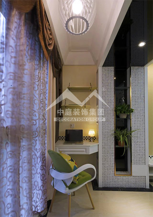 將陽臺用玻璃和木材封閉成居家小書房,窗外的綠葉仿佛伸手可及,好像馬上就會進入居室,自然與居室就這樣在陽臺這個小小空間相交融。為了節(jié)約空間,可將書桌、書架和文件柜都設計得很小巧別致,既提供了完善的實用功能,又不多占空間。