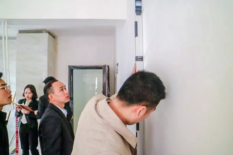 吳總與監(jiān)理部楊經(jīng)理在用靠尺檢驗(yàn)墻面膩?zhàn)庸に囀欠襁_(dá)標(biāo)。