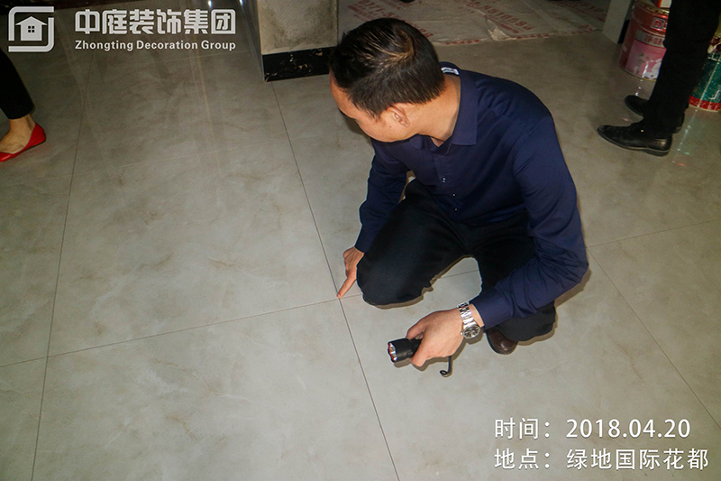 質(zhì)量管理中心吳總在細(xì)心的查驗(yàn)地磚鋪設(shè)平整度