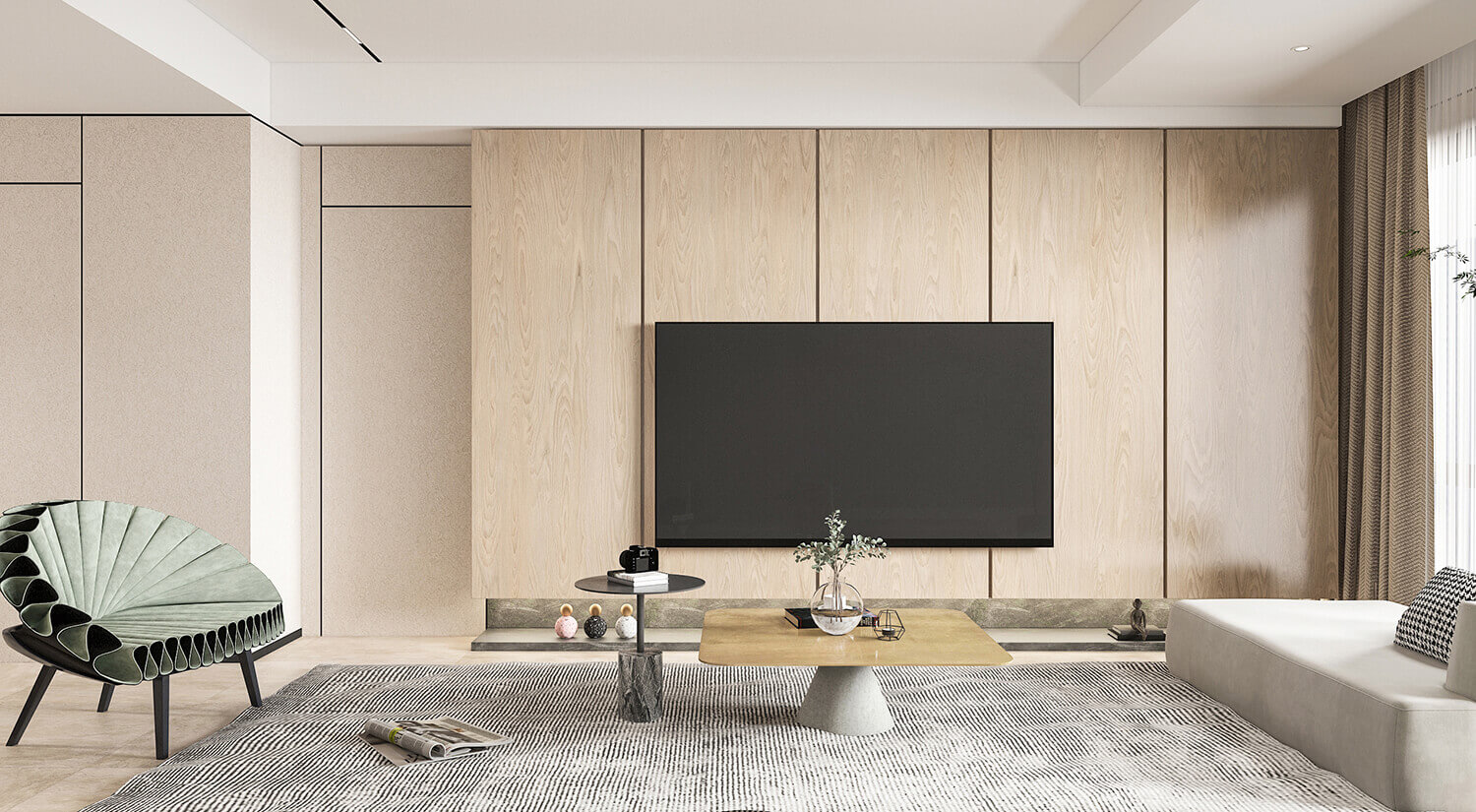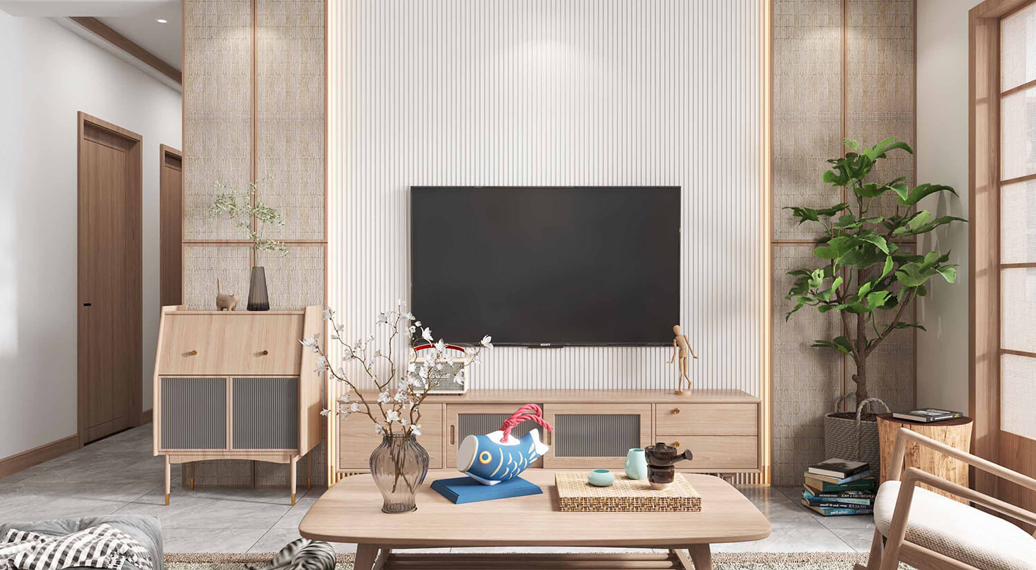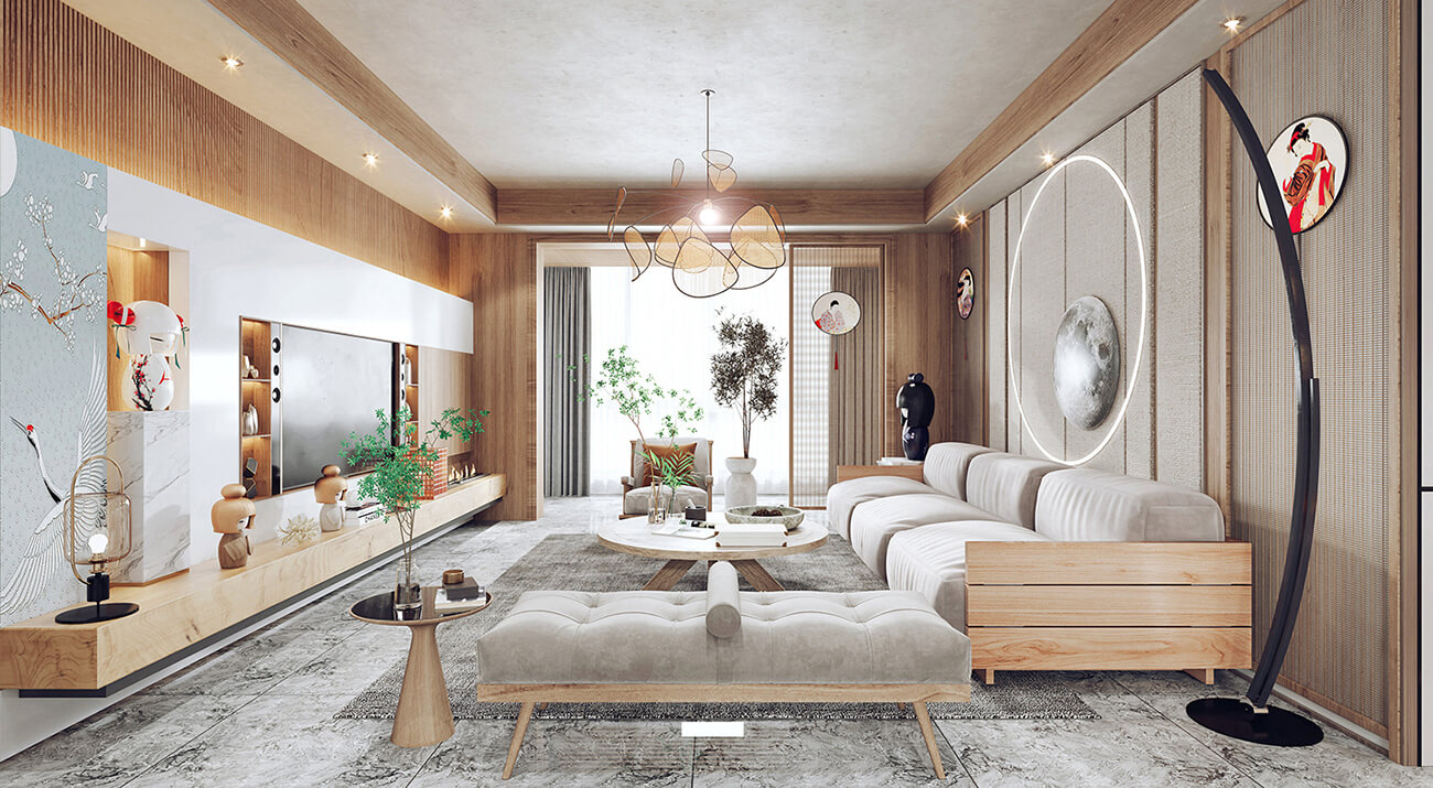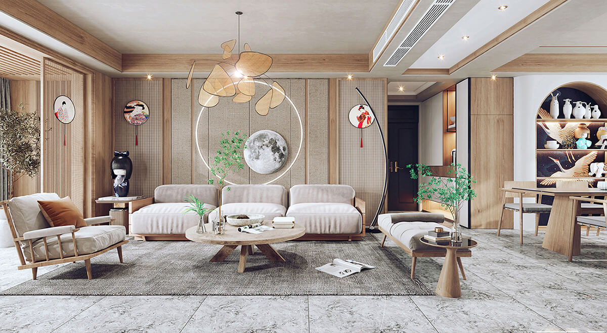 客廳通常被視為日式室內(nèi)設計的重要區(qū)域。通常采用開放式布局,使客廳與餐廳、廚房和走廊相連。使空間富有靈活性。